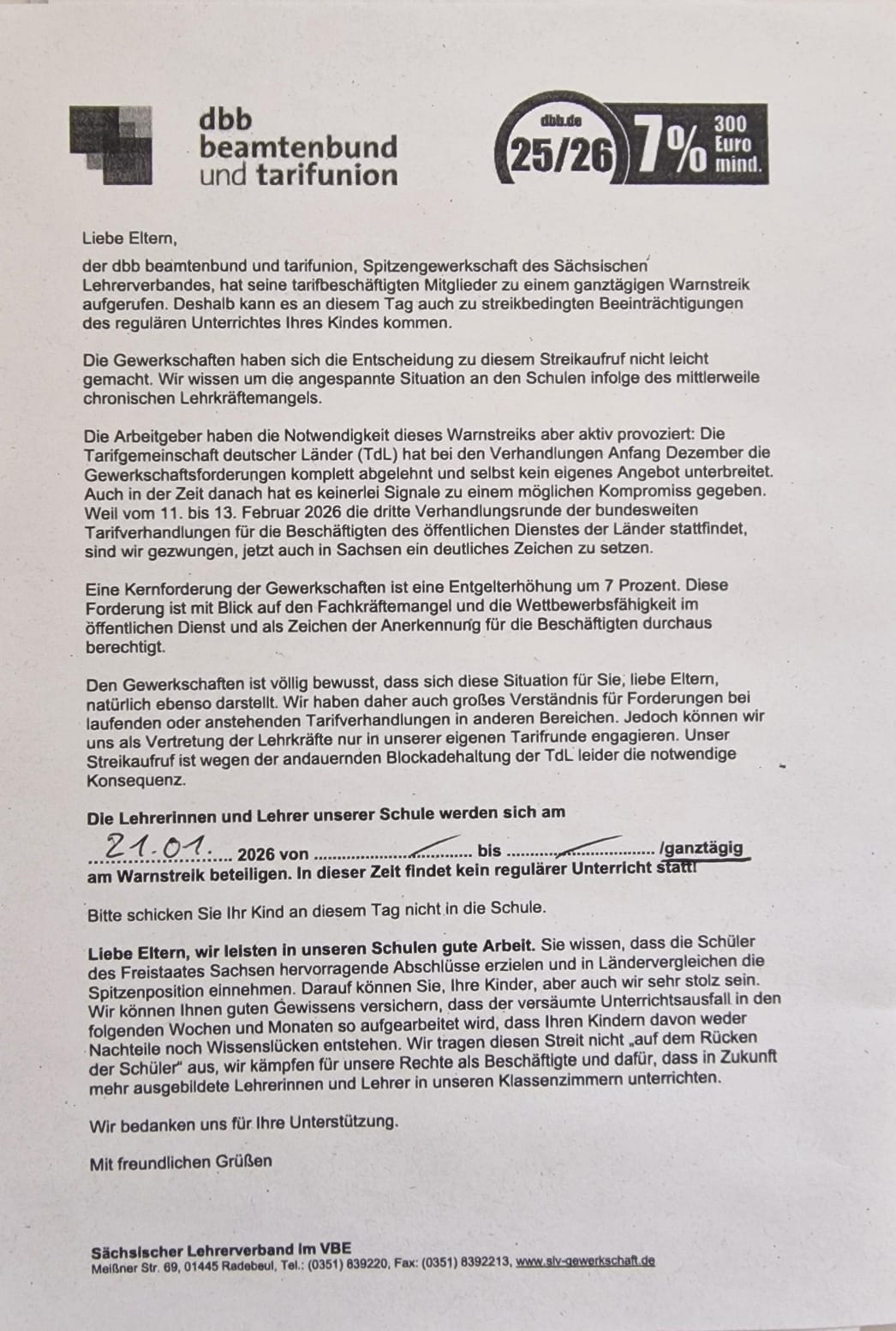 wir möchten Sie darüber informieren, dass am Donnerstag, dem 29.01.2026, unsere Lehrerinnen und Lehrer seitens der Gewerkschaften erneut zu einem ganztägigen Warnstreik aufgerufen sind.